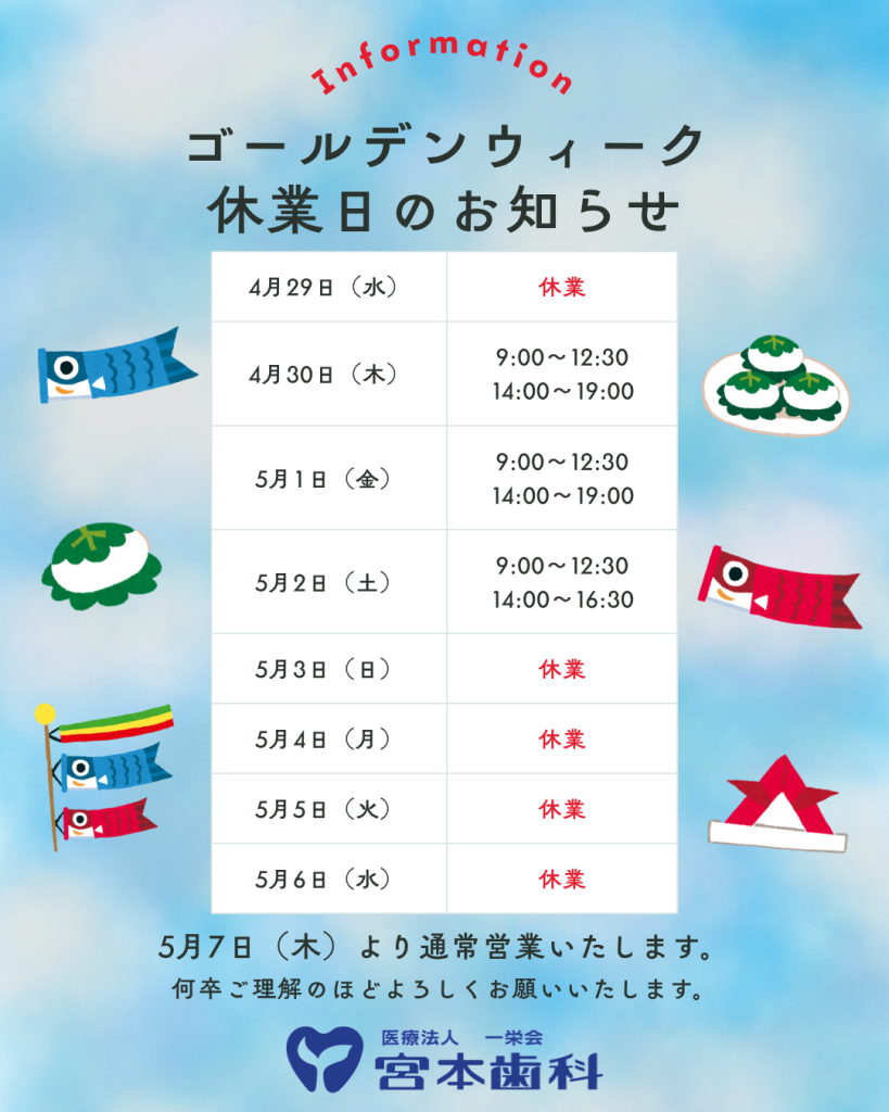2026年のゴールデンウィークはカレンダーのとおり、 4月29日(水)5月 3日(日)~6日(水) はお休みをいただいております。 ご不便をおかけしますが、ご了承ください。 少しでも不安がある方は、お早目の受診をお願い致します。 ☎052-411-...